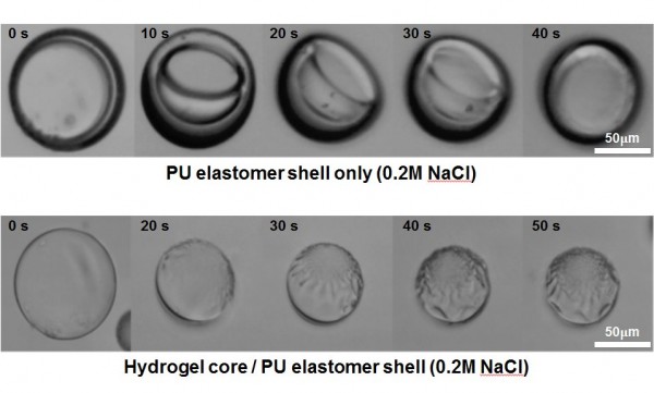 We have fabricated PU elastomer shell particles by using the microfluidic technology. This capsule structure led to improved protection function as well as controlled deformation. Especially, when osmotic pressure was applied to the particles, the shell layer was deformed with a different pattern, which depended on the phase property of the core materials. The water-filled core showed indentation; however, the hydrogel-filled core showed surface buckling. This work is done by Sang Woo. Excellent!!!