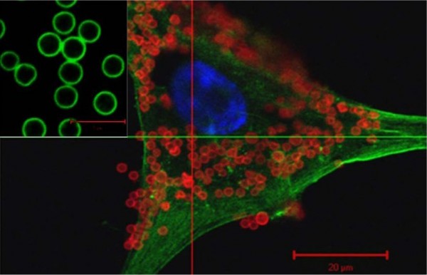 Uniform poly(vinylamine) hydrogel shell particles were fabricated by using the dispersion polymerization and in-situ hydrolysis/crosslinking reaction. They showed an excellent ability to adhere to the cell membrane of normal human fibroblast cells (Photographed by Junoh Kim and Hee-Kyung Chang at Amore-Pacific R&D Center; confocal laser scanning microscope images).